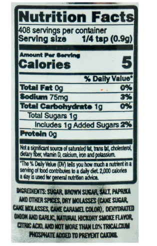 Ingredients: Sugar, Brown Sugar, Salt, Paprika and other spices, Dry Molasses (Cane Sugar, Cane Molasses, Cane Caramel Color), Dehydrated Onion and Garlic, Natural Hickory Smoke Flavor, Citric Acid, and not more than 1.0%. Tricalcium Phosphate was added to prevent caking.