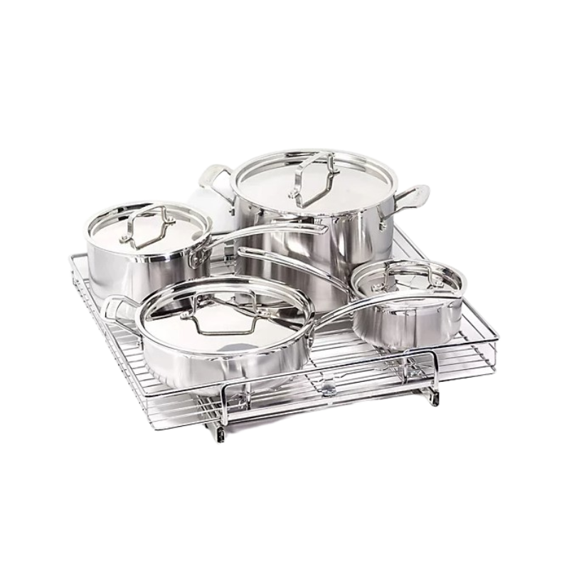 Set of 2 stainless steel undercabinet adjustable drawers.